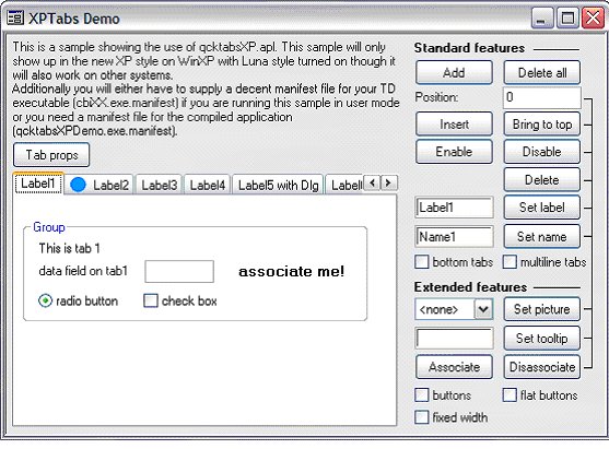 XPTabs is a class library that replaces qcktabs.apl (all settings are kept) and displays tabs in XP style. Additionally there is support for tool tips, images and tab association at runtime. Currently there is a problem with lines and pictures on tabs. This is due to a special behaviour of these child windows (they are unable to paint over other windows).